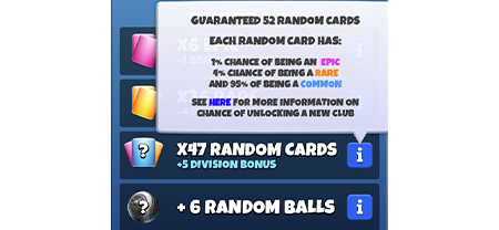 عندما يكافئك صندوق ببطاقات عشوائية، سترى احتمالات الحصول على بطاقة ملحمية أو نادرة أو شائعة مدرجة. على سبيل المثال، قد ينص على أن كل بطاقة تشتمل على فرصة بنسبة 1% بأن تكون ملحمية، وفرصة بنسبة 4% بأن تكون نادرة، وفرصة بنسبة 95% بأن تكون شائعة.
